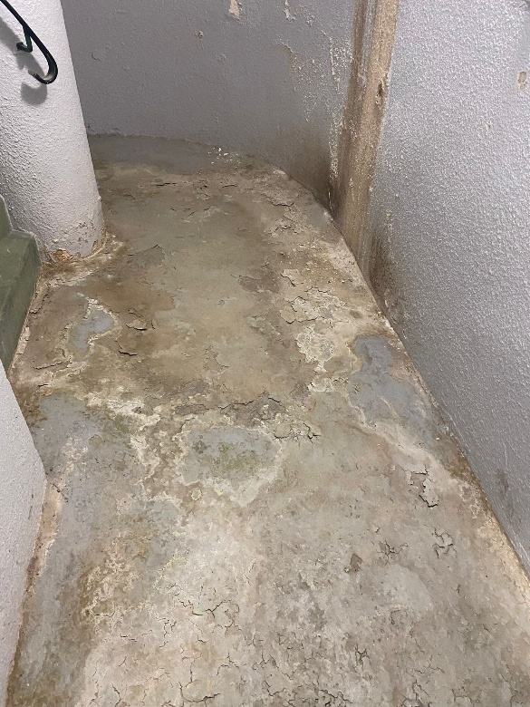 2ème sous-sol du bâtiment C2 : les fuites régulières ont dégradé le sol et on s’interroge sur ces trous dans les murs provoqués par l’eau.