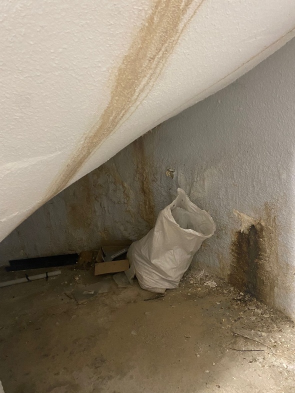 Dans le bâtiment C2, où trois logements ont été déclarés insalubres, le sous-sol des parties communes montrent des fuites anciennes qui ont dégradé les murs.